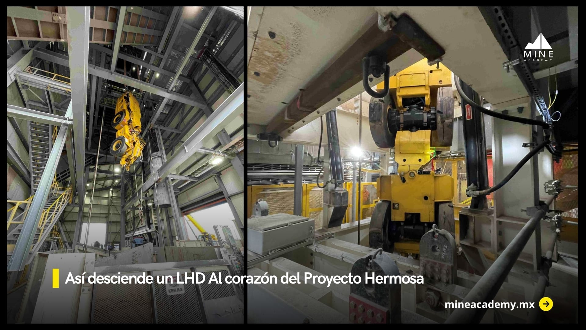 Las imágenes muestran el descenso controlado de un LHD a través del pozo principal, una operación fundamental para habilitar la siguiente etapa minera. Cada maniobra implica coordinación entre equipos de superficie y underground, verificación de cargas, control de tensiones y protocolos estrictos de seguridad.